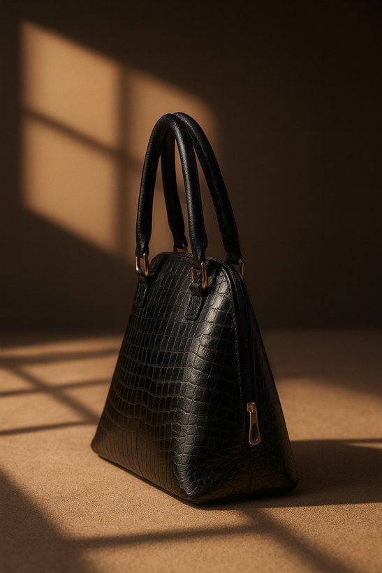 «کیف دستی زنانه مشکی با طرح چرم کروکودیل و دستههای کوتاه»