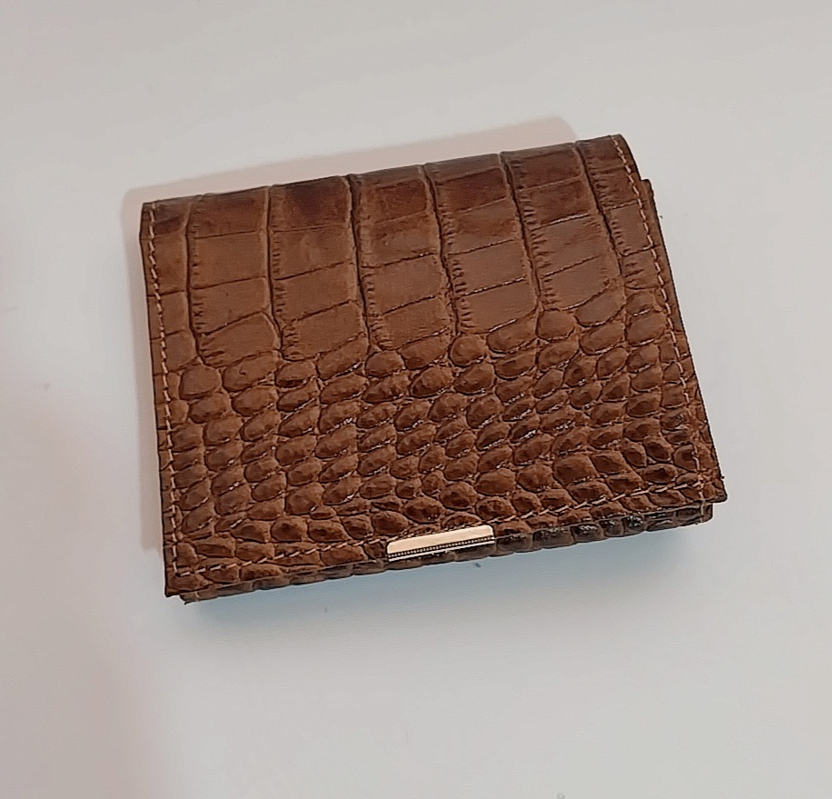 کیف پول و جاکارتی کد۱۲۰ این کیف پول که از چرم طبیعی طرح کروکودیل تهیه شده دارای جای کارتی ویک قسمت زیپ دار و جای اسکناس می باشد در عین جادار بودن کم جا ودارای حجم کمی است